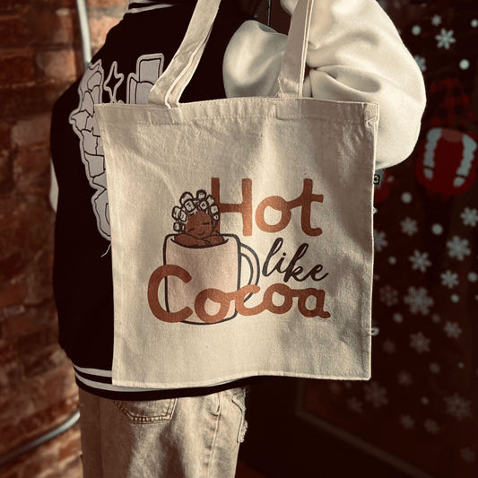 'HOT LIKE COCOA' Beige Tote Bag with Black & Brown Design